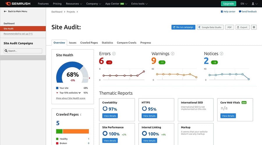 Semrush will scan your site and display any broken URLs in the Crawled pages section.